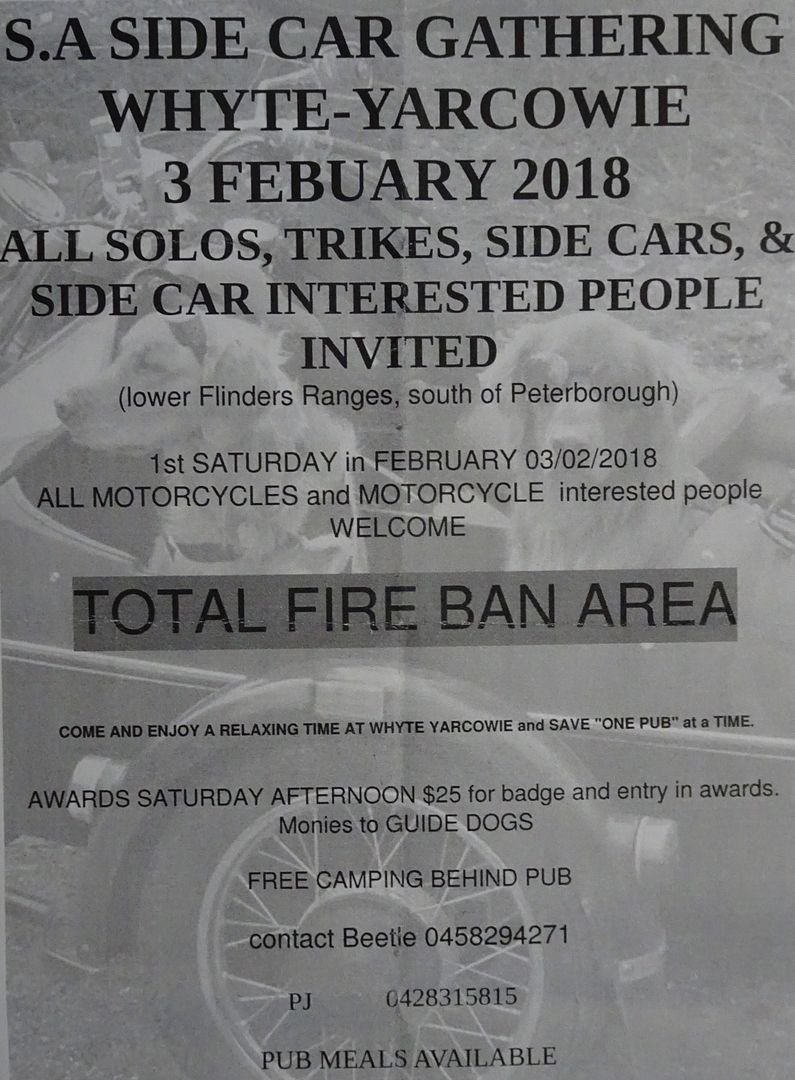 Anyone interested in sidecars and wanting a reason to go for a ride? Hoping there will be few interesting ones at Whyte-Yarcowie 3/4 Feb.
