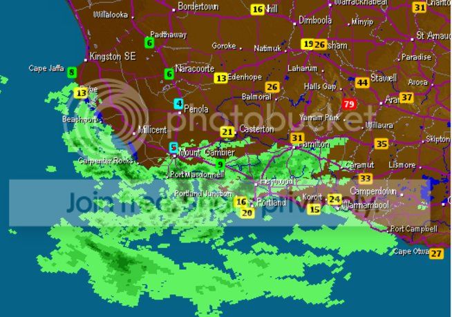 That cloud band is just rotating around, centred on Casterton, not moving away.
