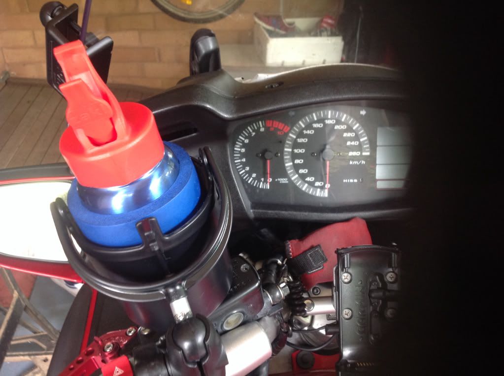 Also, I found this ram-mount cup holder that works really well providing the water container is not too tall, (otherwise the holder seems to tip over too easily and becomes an annoyance). It costs $25 plus postage in Oz and you'll need mounting clamps and brackets. All up about $60 but very solid. I found the perfect matching water bottle with a camel-back style sucking straw in Big-W.